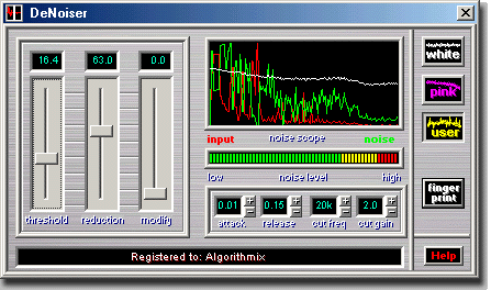 The DeNoiser PlugIn is a single-ended noise reduction system. It effectively removes any kind of broad-band noise: tape hiss, telephone call cut noise, background noise from live recordings, and residual noise from old records after processing with the DeScratcher PlugIn.