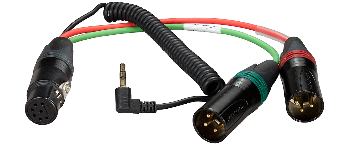 The 11.8" HBY7-35W Breakout Cable from Ambient Recording features 7-pin XLR female to dual 3-pin XLR male connectors and returns via TRS mini right angle plug on coiled cord.