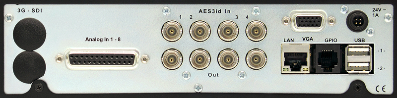 8-ch digital AES3id I/O (BNC), 8-ch analog input (Sub-D), Ethernet, VGA, 2 x USB 2.0, GPIO, 24 V DC connectors.