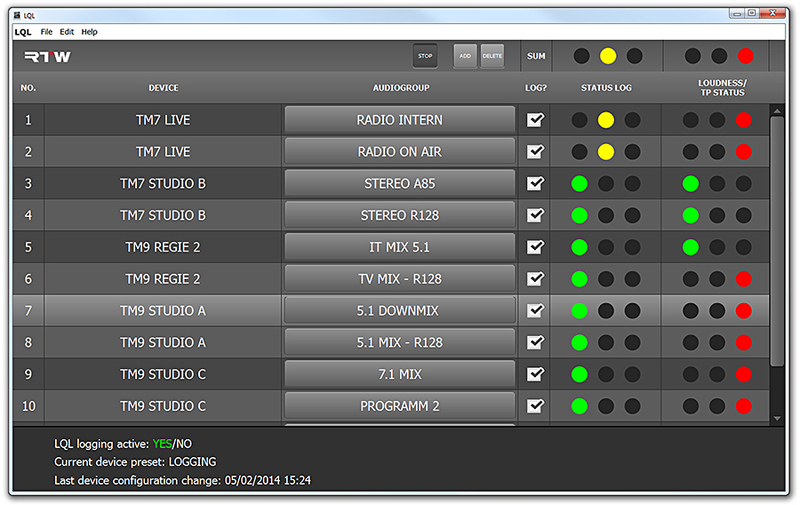 The main window gives an overview about the connected audio devices and their audio groups being enabled to deliver Loudness and TruePeak data. In addition, quality of service for the connection and data is indicated by the colors of the traffic lights. TouchMonitor devices as well as their audio groups need to have biunique names to be able to communicate with LQL. Using the Add dialog, the LQL will access the device with its IP address and indicate it by its name.