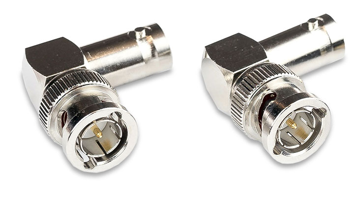 Right angle adapter BNC male - BNC female. Helps with cable management between monitor and camera.Includes two adapters.