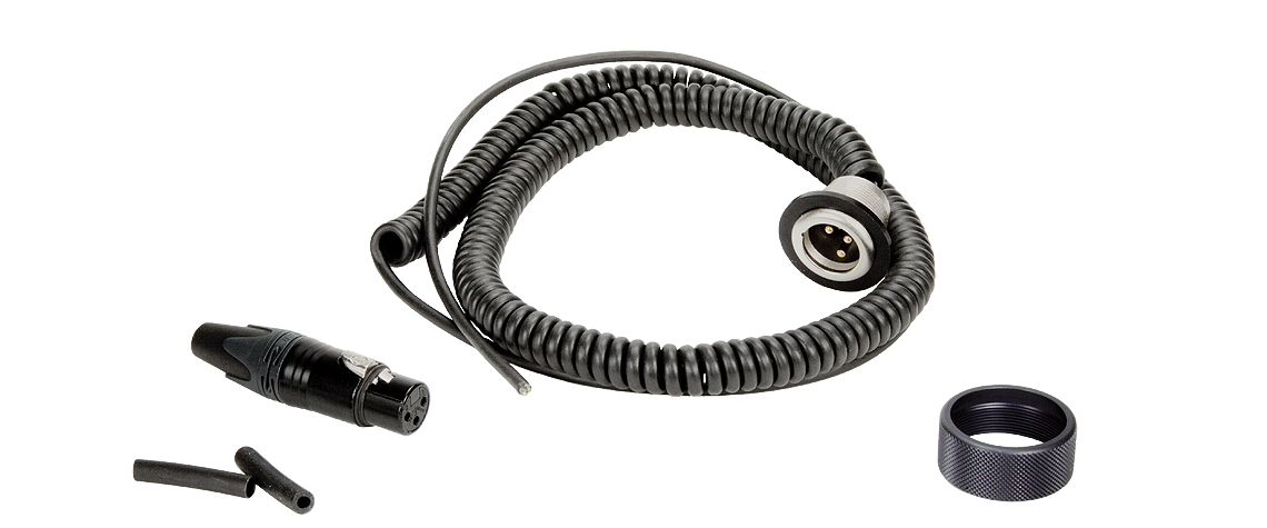 The QXCCSI-130 from Ambient Recording is a cable kit featuring a coiled cable and a female 5-pin stereo XLR connector for the QX 5100 quickpole light boom pole. The kit includes a switchcraft panel mount, a knurled ring nut, and a cable tie.
