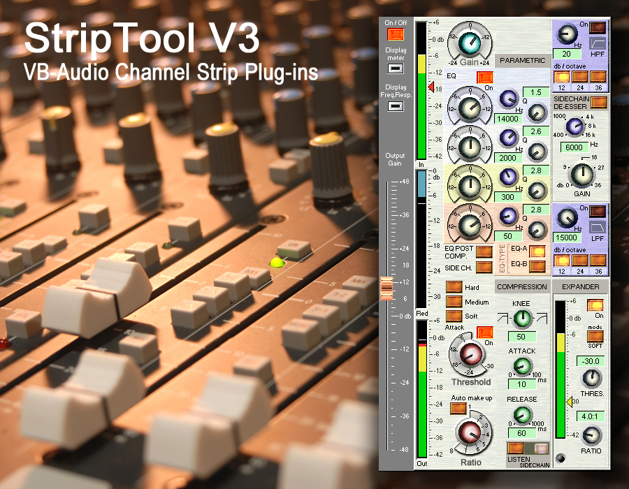 Striptool is a virtual channel strip offering various types of digital audio processing. As with a real mixing desk, you may use Striptool on all channels of a multitrack project. Originally programmed in assembly language in the early 2000s, Striptool can be inserted on every track of your mixing project. Striptool V1, V2 and V3 include everything you need to produce a professional mix : a 4-band parametric EQ, low-pass and high-pass filters, an expander, a de-esser and also input/output level controls...