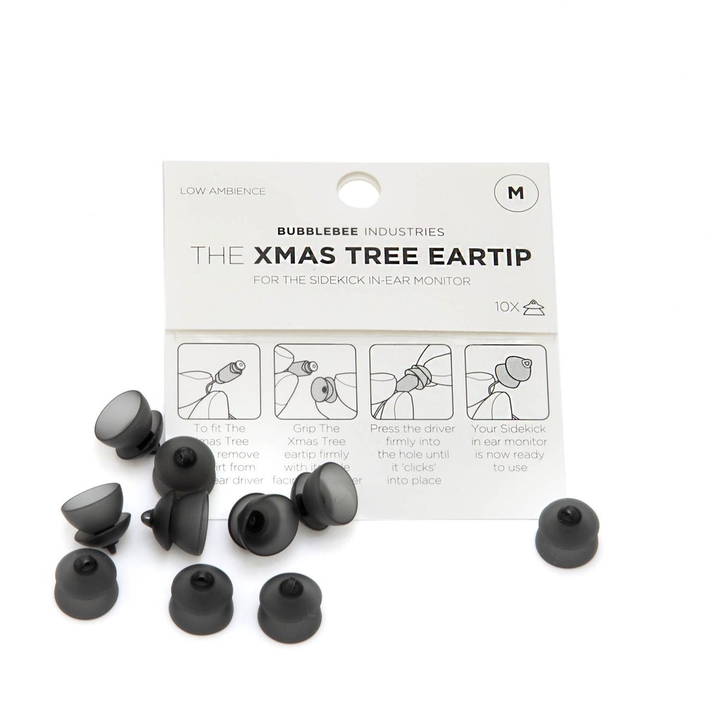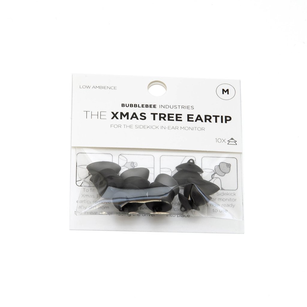 The medium, 10-pack of The Sidekick Christmas Tree Eartip from Bubblebee is an accessory eartip for the Sidekick In-Ear Monitor (sold separately). This eartip offers comfortable all-day wearability and low ambience of your environment, while still having crystal clear communication delivered to the left, right, or both ears.