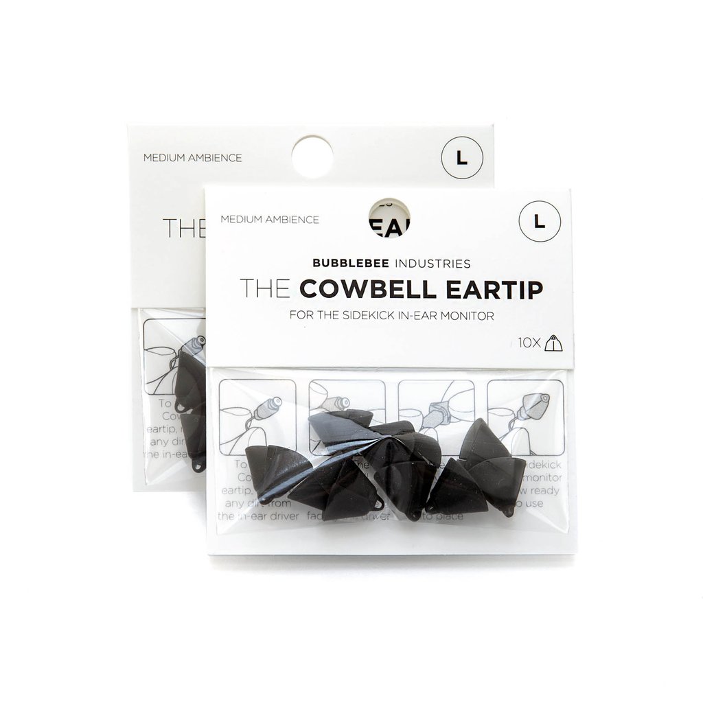 The large, 10-pack of The Cowbell Eartip from Bubblebee is an accessory eartip for the Sidekick In-Ear Monitor (sold separately). This eartip offers comfortable all-day wearability and medium ambience of your environment, while still having crystal clear communication delivered to the left, right, or both ears.