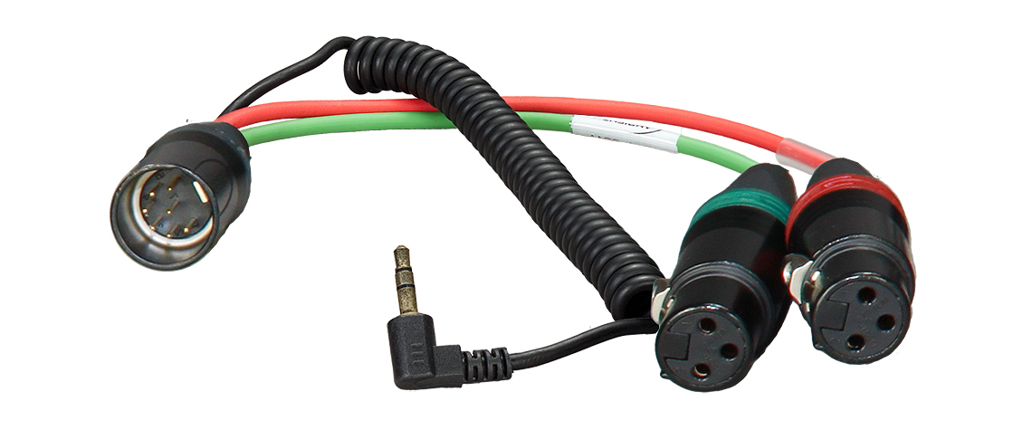 The 11.8" HBYA7-35W Inverse Breakout Cable from Ambient Recording features 7-pin XLR male to dual 3-pin XLR female connectors and returns via TRS mini right angle plug on coiled cord.