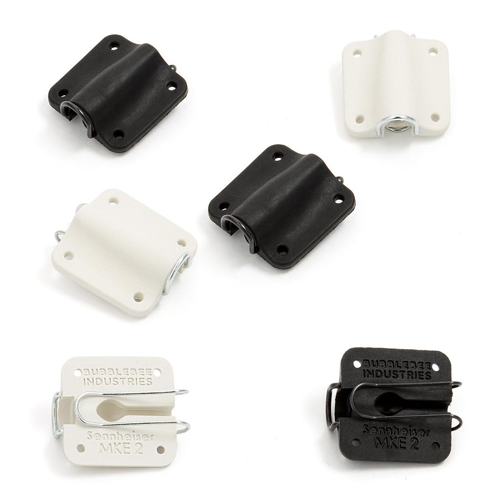 Presented as a set of six (three black and three white), the Lav Concealer for Sennheiser MKE-2 from Bubblebee Industries is for mounting Sennheiser MKE-2 lavalier microphones (available separately) on the body and in clothing or costumes, making it ideal for broadcast, theater, and television production. This soft, pliable mount also acts as a shockmount and barrier, protecting the microphone capsule from vibrations and friction, and giving you cleaner audio quality. In addition, each Lav Concealer includes a customizable clothing clip, a wire fabric guard, and six pieces of The LAV Concealer tape.