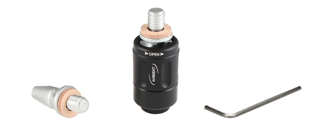 The QR from Ambient Recording is a quick release tip for microphone boompoles and can be used to provide a noise-free joint for attaching microphones, shock mounts, and other accessories.