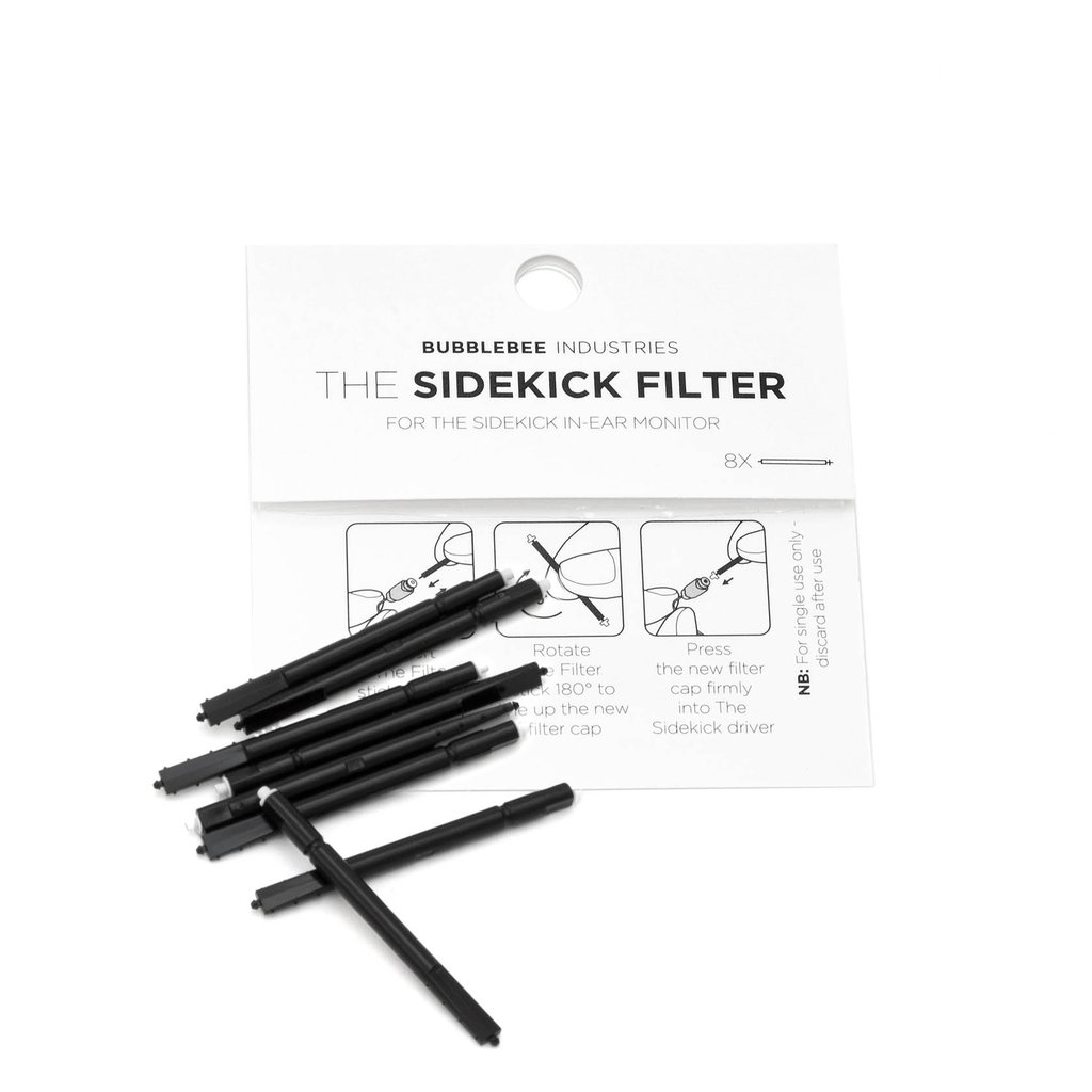 The 8-pack of The Sidekick Filter from Bubblebee is an accessory for the Sidekick In-Ear Monitor (sold separately). It is a tool designed to remove a driver's white speaker filter from the in-ear monitor and swap it out for a new filter. The filter is included with the tool.
