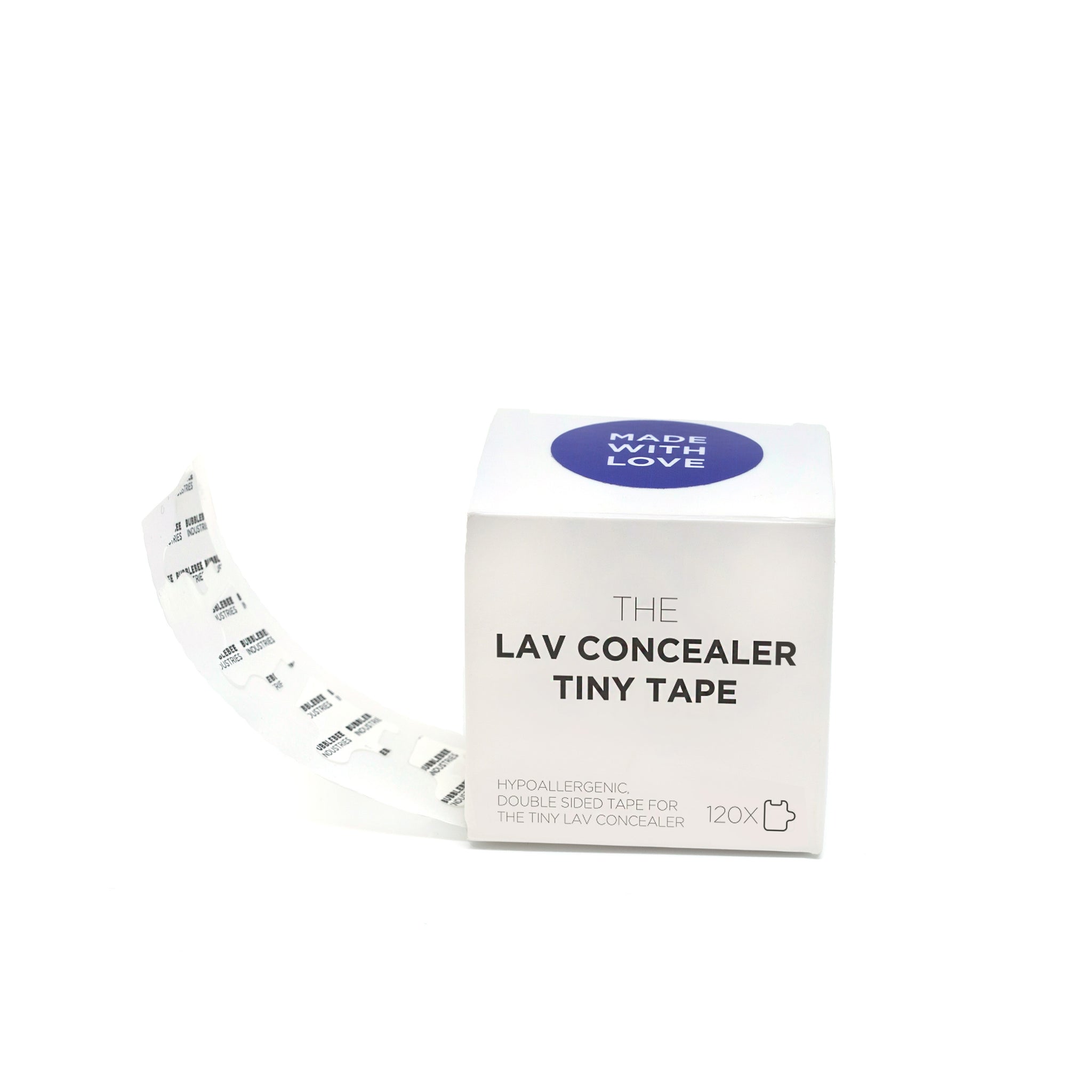To apply The Lav Concealer Tiny Tape, simply lift the tape from the backing tape using the thumb-tab. Then line up and press the glue-side firmly onto The Lav Concealer. Then, use the thumb-tab to remove the guard paper, leaving the double sided tape on the concealer. Fit directly to clothing, skin or other surfaces without worry!
