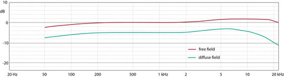 • A frekvenciaátvitel a diffúz hangtérben hasonló a 0 ° átvitelhez enyhe levágással a nagy frekvenciákon.